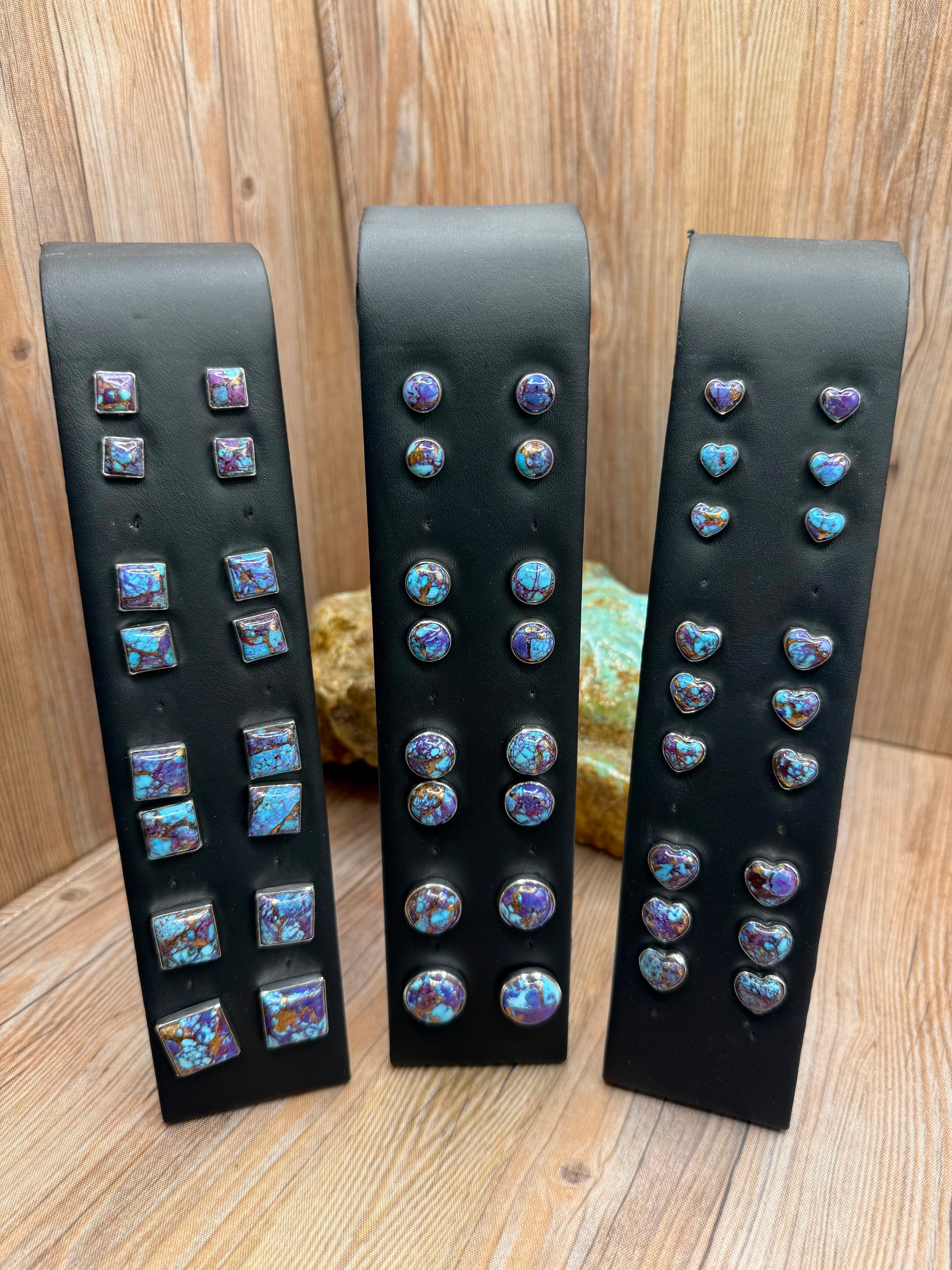 Mohave Purple stud earrings. Set in sterling silver. Available in a heart, round or square shapes and available in 5 sizes.